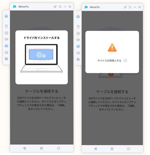 ステップ3. 初めて接続する場合、コンピュータにドライバーがないかもしれません。まずはドライバをインストールする必要があります。ドライバが正常にインストールされたら、デバイスを再接続してMirrorToを再起動してください。