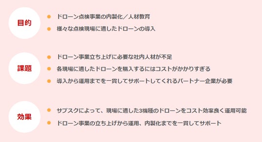 加えて、現場ごとに異なる点検要件に応じたドローンの運用を望んでいたものの、各機体を個別に購入するのは高額なコストがかかるという課題を抱えていました。