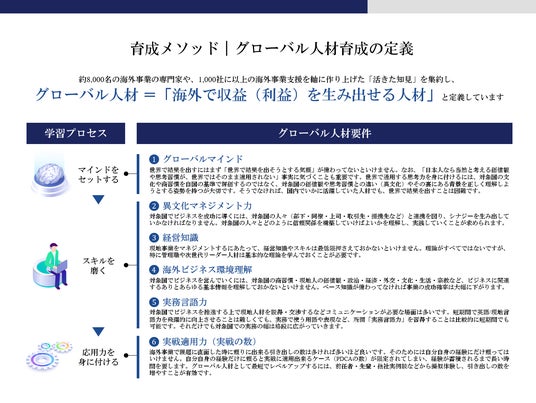 インサイトアカデミーは、約8,000名の海外事業の専門家や、1,000社以上の海外事業支援軸に作り上げた「活きた知見」を集約し、グローバル人材を「海外で収益を生み出せる人材」と定義。