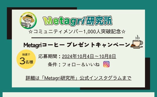 Metagri研究所は、コミュニティメンバー1,000人突破を記念して、公式Instagramをフォローしキャンペーン投稿に「いいね」をすることで、抽選で3名様へMetagriコーヒーをプレゼントするキャンペーンを開催します。応募資格は日本国内在住のInstagramユーザーで、公式アカウントをフォローし、投稿が公開設定であることです。