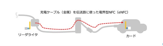 eNFCはNFC(約10cm程度)に比べて通信エリアを圧倒的に拡張することができる技術(特許取得済)。