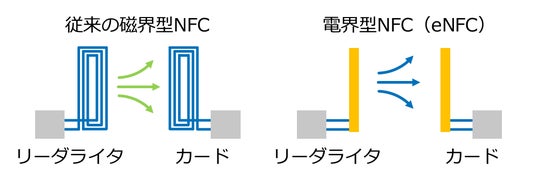 コイルとコイルを磁界で結合させる従来のNFC(近距離無線通信)ではなく