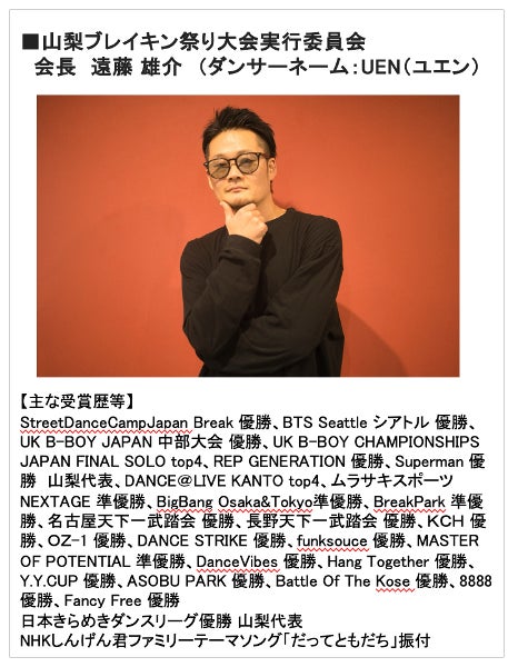 本大会実行委員会会長には、ブレイキンソロバトルをメインに国内外の数々の大会で優勝経験があり、公益社団法人日本ダンススポーツ連盟 (Japan DanceSport Federation :略称 JDSF) のブレイクダンス山梨県部部長を務めているUEN(ユエン)が就任し、イベントオーガナイザーとしてイベント開催します。