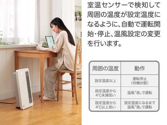 ・おまかせモード搭載。室温センサーで検知し、室温に応じて自動的に運転の開始・停止・風量をコントロール。