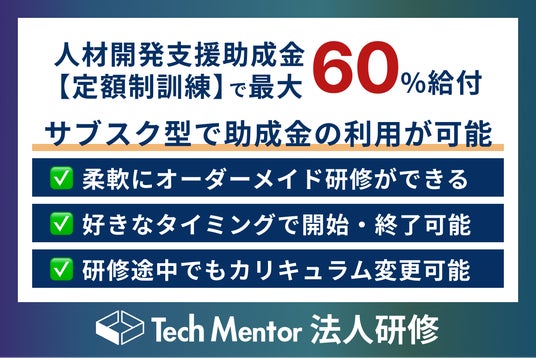 【最大60%助成】Tech Mentor法人研修、サブスク型オーダーメイド研修を提供開始!必要なだけ研修を受けられる柔軟なシステムを提供