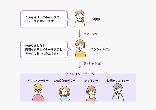 プロのクリエイティブコンシェルジュが一緒に寄り添い、最適なクリエイターとのマッチングを提供します。制作に関するあらゆるニーズに対応し、Vtuberデビューから日々の配信、さらなる成長までを総合的にサポートします。