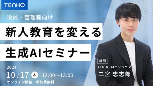 生成AIに関する研修事業を展開する株式会社TENHO(本社:東京都渋谷区、代表取締役:田村 允)は、2024年10月17日(木)に第5回無料ウェビナー「【管理職・役員向け】新人育成における効果的な生成AIの活用方法」を開催いたします。管理職・役員の方々を対象に、新人育成における最新の生成AI活用法を具体的に解説します。今回も前回同様、デジタルシティ株式会社(本社:東京都渋谷区、代表取締役:大島 予章)との共催になります。