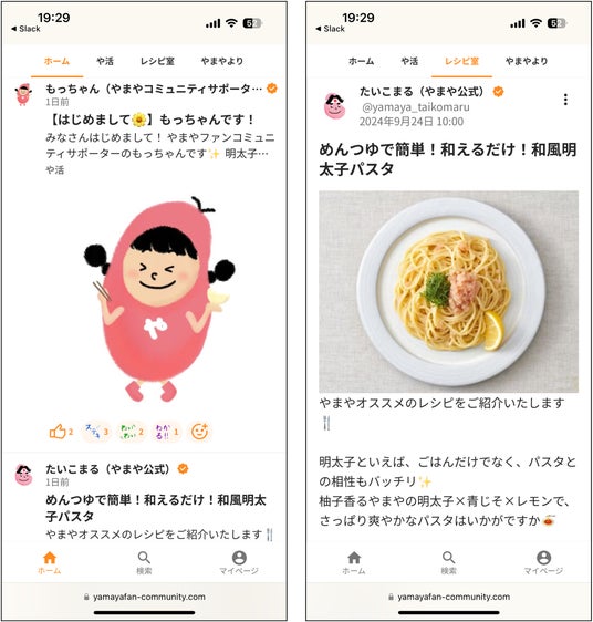 「今日、やまやのお店で明太子を食べたよ!」「いつも行くお店でこんなやまやの商品みつけちゃった!」など、「やまや」の商品や全国に展開する店舗に関する投稿をお楽しみいただける、通称「や活(やまや活動)」のほか、イベント情報や特別コンテンツの配信を閲覧や、参加者同士でオリジナルレシピやアレンジレシピを共有する場としても活用いただけます。