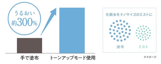 ナノサイズの冷ミストが毛穴の奥まで入り込み、約1分間の「モイストモード」で摩擦レスな高浸透*4保湿ケアを実現。約4分の「トーンアップモード」を使用すると手の塗布よりも約300%※うるおいがアップします。