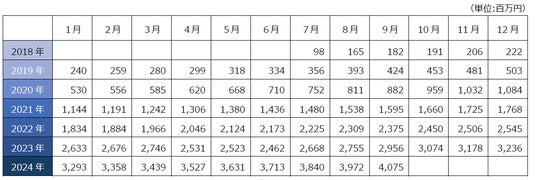 (注)ARR(Annual Recurring Revenueの略称で、契約更新のタイミングで全て更新される前提で、1年間で得られると想定される売上高)は、決済手段により3か月毎に1か月の日数(通常月は28営業日、特別月は35営業日)に変動があること、四半期決算期末月毎に決算調整を行っていること等から、月次では金額が変動するため、3か月移動平均を採用しております。