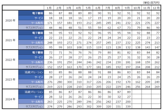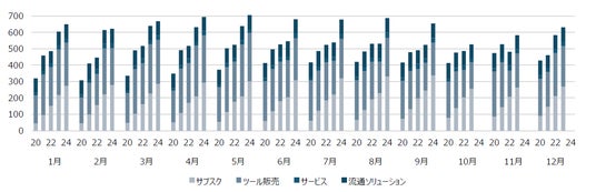 サブスクリプションは、CLIP STUDIO PAINT サブスクリプション売上です。ツール販売には、一括支払いモデルのダウンロード版や法人向けライセンスの売上などが含まれます。サービスには、CLIP STUDIO WEBサービスでの売上などが含まれます。流通ソリューションには、DC3および電子書籍に関連する売上が含まれます。