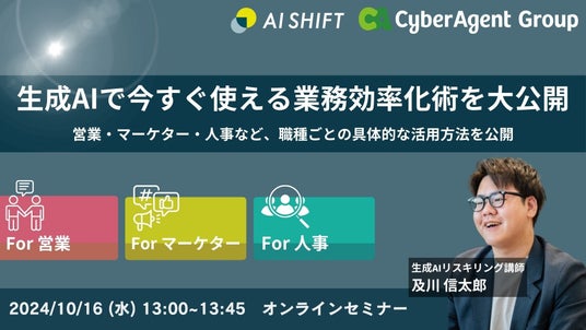 株式会社サイバーエージェント(本社:東京都渋谷区、代表取締役:藤田晋、東証プライム市場:証券コード4751)の100%子会社で、生成AIを活用した業務改革を総合的に支援する株式会社AI Shift(本社:東京都渋谷区、代表取締役社長:米山結人)は、生成AI活用で今すぐ使える業務効率化術を公開するオンラインセミナーを開催いたします。