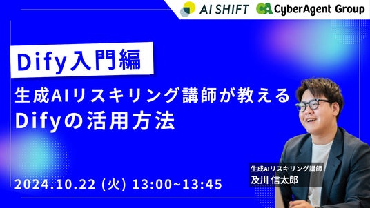 株式会社サイバーエージェント(本社:東京都渋谷区、代表取締役:藤田晋、東証プライム市場:証券コード4751)の100%子会社で、生成AIを活用できる人材を育成する生成AIリスキリングを提供する株式会社AI Shift(本社:東京都渋谷区、代表取締役社長:米山結人)は、生成AIアプリ開発ツール「Dify」の活用に特化した「生成AIリスキリング Difyコース」の提供を開始しました。