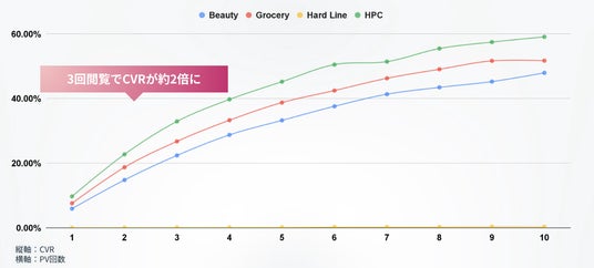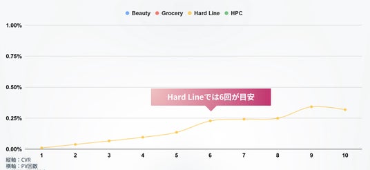 Hard Lineに関しては、6回閲覧まではCVRが上がり続けることがわかりました。Hard Lineについては比較的購買金額が高くなるため、他のカテゴリに比べるとより深い商品理解・ブランド理解が必要と考えられます。