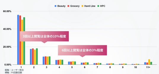 特に、1回閲覧ユーザーに比べ、3回閲覧ユーザーは、CVRが約2倍になるため、商品同士の回遊性を上げる施策が重要だといえます。