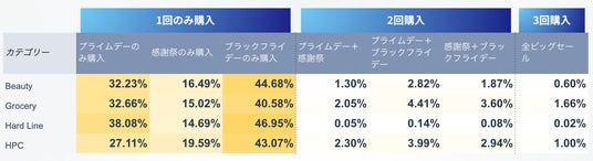 一方、プライム感謝祭でのみ購入したユーザーは2割以下でしたが、昨年はセール自体の認知度が低かったこと、日数が短かったことが要因と想定されます。今回も「感謝祭でのみ購入するユーザー」の割合が一定あると想定すると、他のビックセールではなく、プライム感謝祭でしか獲得できないユーザーを取りこぼしなく、施策を行う必要があると言えるでしょう。