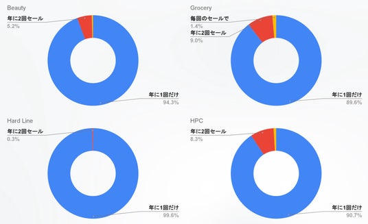 上図は年間に何回セールで同じメーカーのものを購入をするかの割合を示したグラフです(対象は1回以上)。Amazonでは、プライムデー・プライム感謝祭・ブラックフライデーの大きく3つのビッグセールを開催しています。どのカテゴリにおいても年に複数回同じメーカーの商品を購入するユーザーは少ないことがわかります。