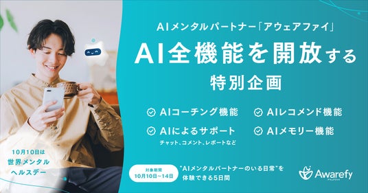 AIメンタルパートナー「アウェアファイ」を提供する株式会社Awarefy(本社:東京都新宿区、代表取締役 CEO 小川 晋一郎)は、2024年10月10日の世界メンタルヘルスデーに合わせ、すべてのユーザーさまにアウェアファイのAI全機能を開放する体験キャンペーンを実施します。このキャンペーンは、10月10日(木)から10月14日(月)までの5日間にわたり開催されます。