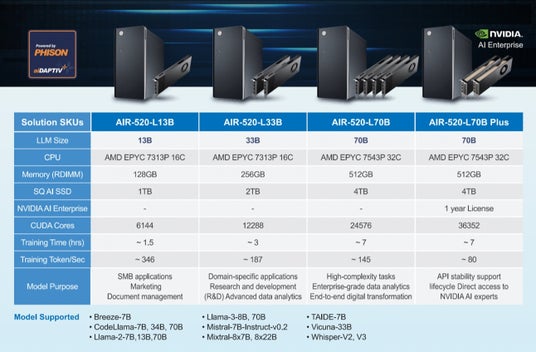 すべてモデルには、Phison社の「aiDAPTIV+ 」技術を活用した「SQ ai100 AI SSD」が搭載されています。これらのSSDはGPU VRAMの拡張として機能し、最小限のGPUカードでLLMを微調整することが可能なためコストをおさえることが可能です。また「AIR-520」の本体サイズは、380(幅) x 176(高さ) x 454.1(奥行き) mmとデスクトップPCと同等で、従来の大型ラックマウントサーバーと比べスリム仕様であり、4Uのラックマウントに設置することが可能です。