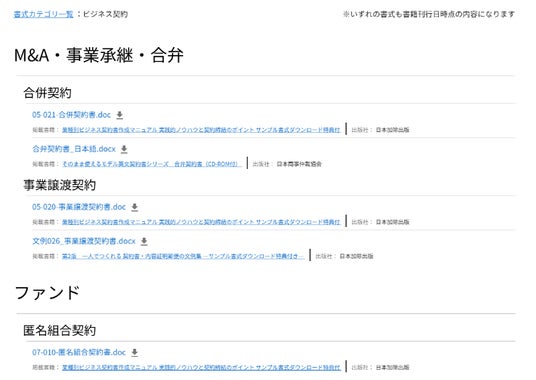カテゴリを選択すると当該カテゴリの書式が表示され(図では「ビジネス契約」を選択した場合)、ファイル名をクリックすることでWord等のファイル形式でダウンロードすることができます。また、掲載書籍名をクリックすることで掲載書籍の閲覧画面へワンクリックで遷移することもできます。