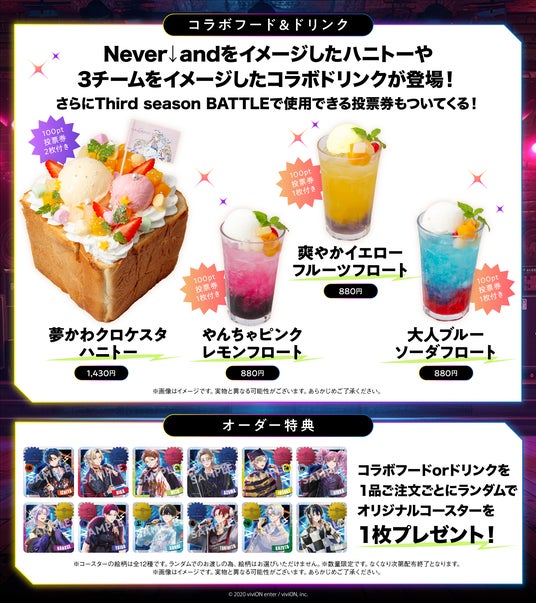 また、パセラ名物のハニトーやオリジナルドリンクが楽しめる『コラボメニュー』 をご注文いただいたお客様への『描き下ろしイラストコースター』と〈Third season BATTLE all for one〉で使用できる投票ptをプレゼントします!
