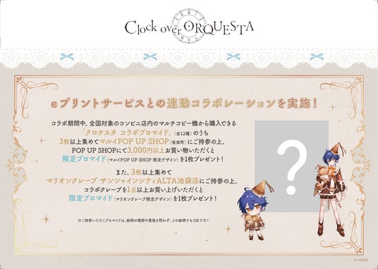 株式会社viviON (所在地:東京都千代田区、代表取締役:明石耕作) は、SNS連動型キャラクターソングプロジェクト『Clock over ORQUESTA(クロック・オーバー・オルケスタ)』(通称:クロケスタ)のポップアップストアを、11月2日(土)から11月24日(日)の期間中「有楽町マルイ」において開催する運びとなりました。池袋、秋葉原で予定しているコラボレーション企画とあわせてご案内します。