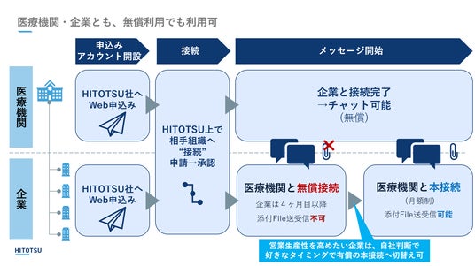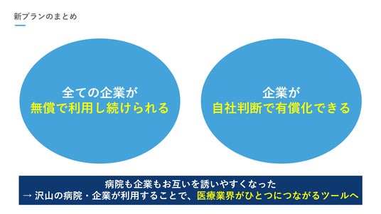 企業に関しては、無償の基本プランでも、医療機関と接続してメッセージのやりとりが可能ですが、各医療機関と接続後4カ月目以降は、写真やPDFなどのファイルの送受信ができなくなります。この間に有用性を確認いただき、拡張利用(有償の本接続へのアップグレード)をご検討いただきたいと考えています。