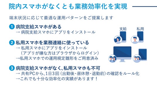 病院支給スマートフォンを導入していない医療機関においても、様々な運用パターンが可能です。共有パソコンのみで運用している病院様においても十分な業務効率化を実感いただいています。