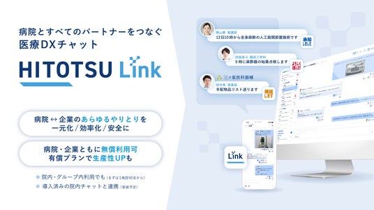 新ブランドコンセプトは「病院とすべてのパートナーをつなぐ医療DXチャットHITOTSU Link」。手術室看護部門や災害地域連携での導入事例も公開中