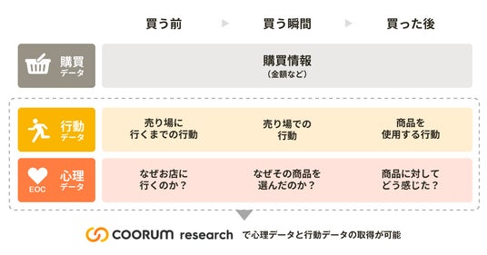 coorum research を活用することで、顧客の本音が載せられた顔の見える“購買データ”をメーカー自らで直接収集し、顧客がどのように自社商品を買うに至るのか、そして買った後に日々の生活でどのように使っているのか、理解することができます。