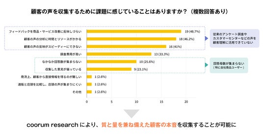Asobicaが「coorum」導入企業向けに、顧客の声を収集する上での課題に関してヒアリングしたアンケートでは、第1,2,3位に「従来のアンケート調査やカスタマーセンターなどの声を、顧客理解に活用できていない」、第5,6位に「(特に自社商品ユーザーの)回答母数が集まらない」といった意見が寄せられていました。