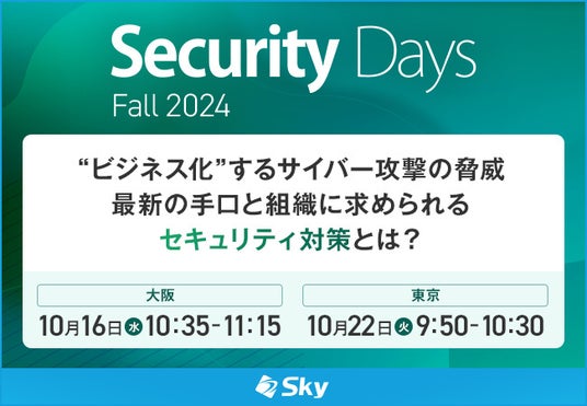 Sky株式会社は、グランフロント大阪で10月16日(水)、JPタワー・KITTE(東京)で10月22日(火)~25日(金)に開催される、株式会社ナノオプト・メディア主催のセミナー・展示会「Security Days Fall 2024」にて、講演を実施します。