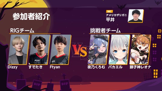 挑戦者チームとして、人気ストリーマー「パカエル」「夜乃くろむ」「獅子神レオナ」の3名が、RIGチームと戦います。
