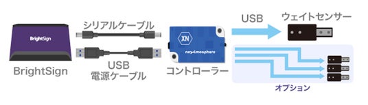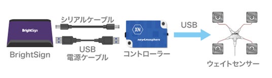 当製品は、センサー、コントローラー、ケーブルがセットになったキット製品です。1つのコントローラーに最大8つのウェイトセンサーを接続でき、追加用センサーはオプション品としてご購入いただけます。トリガー設定は「BrightSign」のオーサリングソフトウェア「BrightAuthor」を使用して簡単に行えます。