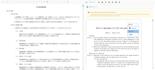 また、外国籍従業員を雇用する企業の人事労務担当者は、自動で英語に翻訳されることにより、手間をかけることなく簡単に英語の規程を用意することができます。