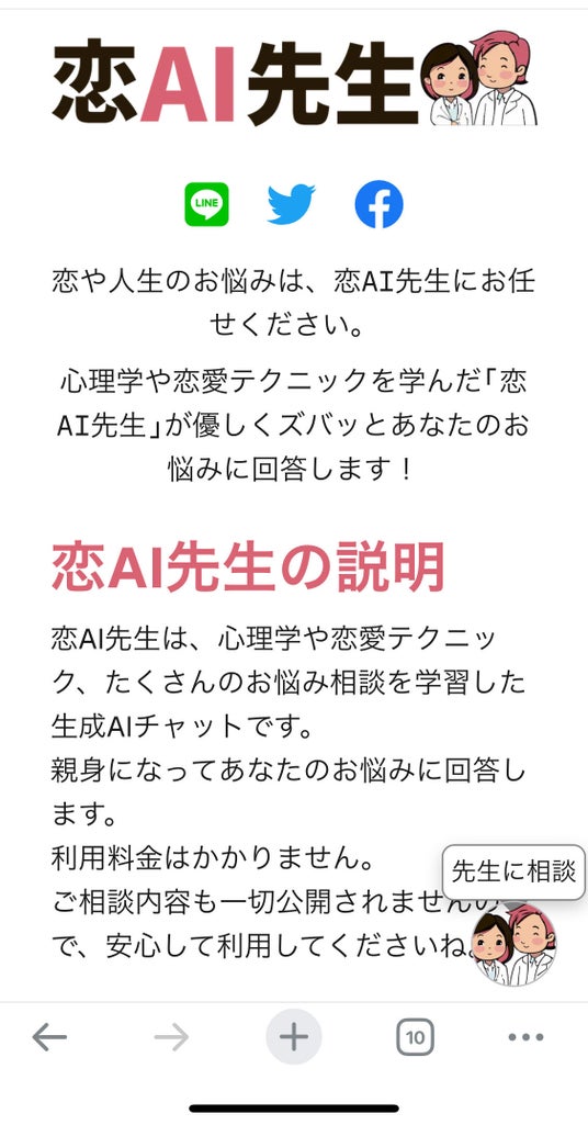 恋AI先生は、心理学や恋愛テクニック、たくさんのお悩み相談を学習した生成AIチャットです。