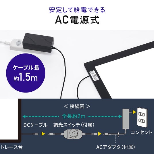 安定した電力供給を提供するAC給電方式を採用。長時間の使用でも明るさが落ちることなく、一定のパフォーマンスを発揮します。電源ケーブルの長さは1.5mと十分な余裕があり、広い作業スペースでも快適に使えます。