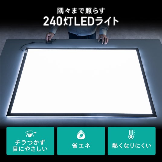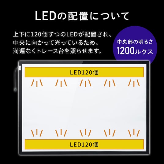 トレース台には、上下に120個ずつ、合計240個のLEDライトを搭載。端までムラなく明るく照らすので、作業中に影ができる心配がありません。1200ルクスの強力な明るさと自然光に近い光源が、長時間の作業でも目に優しく疲れにくいです。