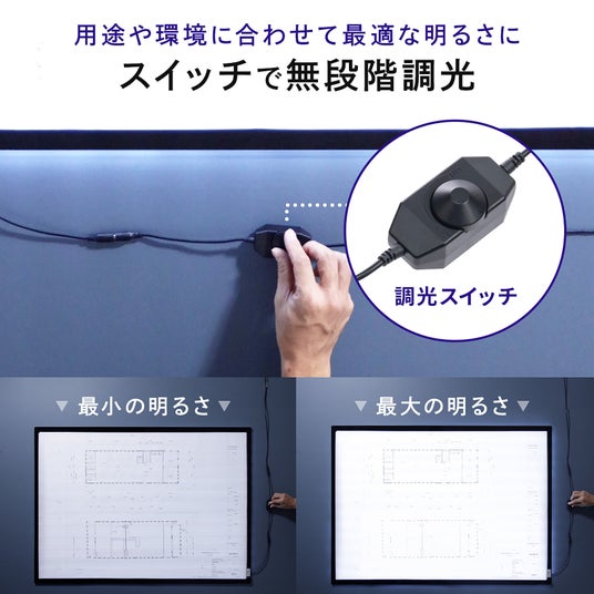このトレース台は、ダイヤルスイッチを使って簡単に明るさを調整でき、作業内容に合わせた最適な環境を整えることが可能です。必要な明るさを瞬時に調整できるため、どんな作業にも柔軟に対応します。