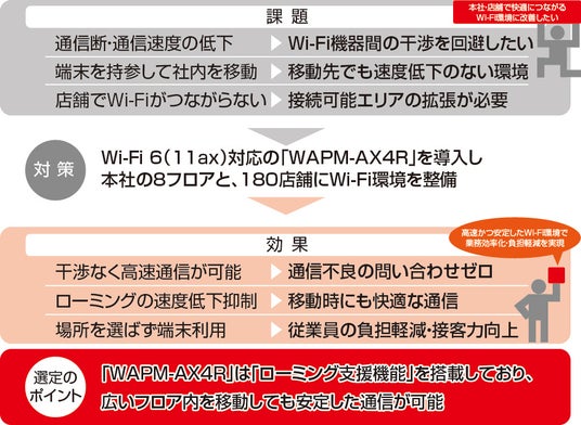 本社と180店舗のWi-Fi機器を刷新してネットワーク環境を再整備。Wi-Fi 6(11ax)対応機器の導入で高速・安定した通信が可能に