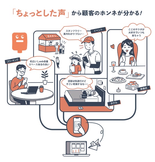 ホンネPOSTは「本格的なVOC分析(顧客の声)を、誰でも簡単に」をコンセプトに、 店舗/施設やイベント・地域の生の声を収集しマイクロニーズ/ペインを手軽に発掘できる、 デジタル手紙の顧客コミュニケーションツールです。集まった声は感情分析AIで潜在ニーズや離脱のリスクポイントを抽出し、 深い顧客理解を通じたビジネスの成長を支援する、VOCソリューションとして展開しています。
