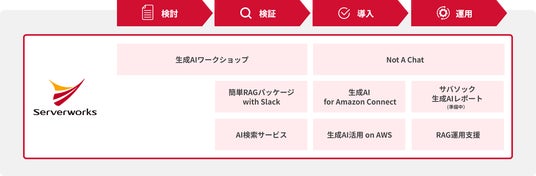 社員一人ひとりの事務作業はより効率的に改善され、ビジネスプロセスは大きな変化を迎えています。そこでサーバーワークスは、2024年7月よりアマゾン ウェブ サービス ジャパン合同会社より開始された「AWS 生成AI実用化推進プログラム」に参画し、生成AIの活用に関する相談からスキルアップ、導入、そして効果的な運用まで、全フェーズをワンストップで対応するサービスの提供を開始いたしました。