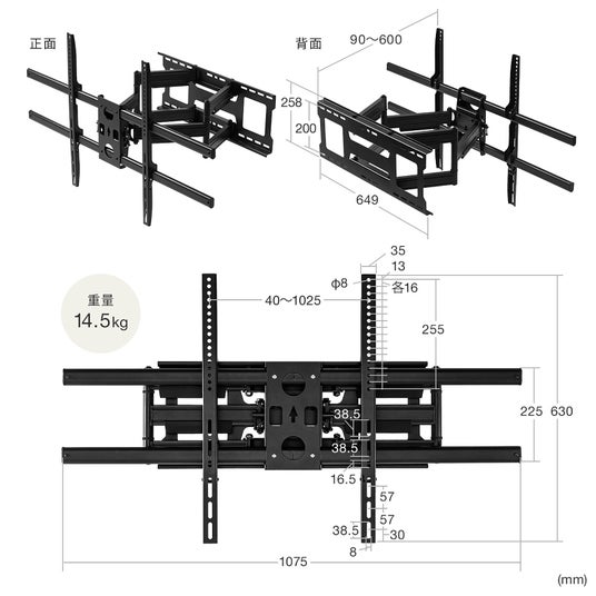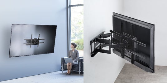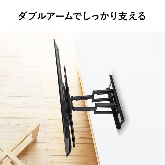 ダブルアームで前後の移動や角度調整も可能な耐荷重100kgで55-100インチまで幅広い機種に対応する大画面テレビ壁掛け金具