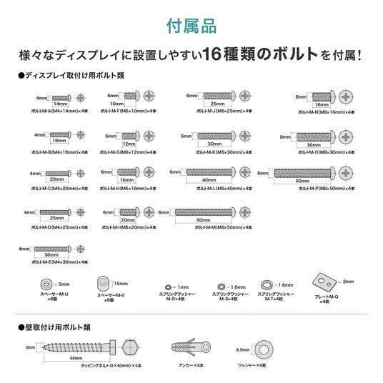取り付け穴はVESA規格1000×600まで対応しています。スペーサーが付いているため、段差や背面のコネクタ・端子が差しにくい場合でも設置できます。