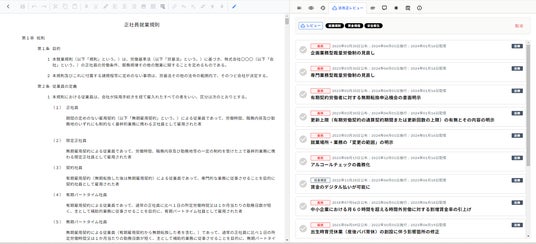KiteRaで作成した規程に対して、法改正に関連する可能性がある条文の検知、及び法改正の概要・確認ポイント・規定例の提供を行う機能です。「KiteRa」両サービスにおいて、KiteRaで作成した規程を法改正対応に伴い見直しをする際に、法改正情報を表示し直感的に挿入することができます。