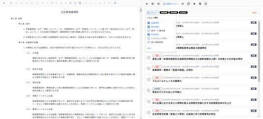 規程管理システムを提供する「KiteRa」では、そのような法改正に伴う規程管理業務を効率化するため、レビュー機能を設けています。これにより、法改正の概要や規程例をスムーズに確認できるため、情報収集や改定案作成時間の削減に繋がります。