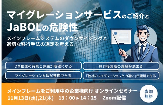 本セミナーでは、特に市場で広がりつつある「JaBOL」技術に対する懸念を取り上げ、COBOLコードをJavaでラッピングして簡易にオープンシステム上で稼働させる手法の危険性について解説いたします。短期的な移行コストの削減が見込まれる一方で、技術的な負債や将来的な保守性の問題が顕在化する可能性があります。