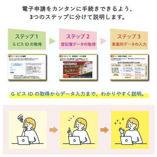 ・さらに「電子申請のトリセツ」を利用の方には、自治体(連絡会)と連携した電子申請セミナーや、事業所向けの無料診断アドバイスなど、個別のサポートにも対応します。(サポート内容によっては、調整となる場合があります)