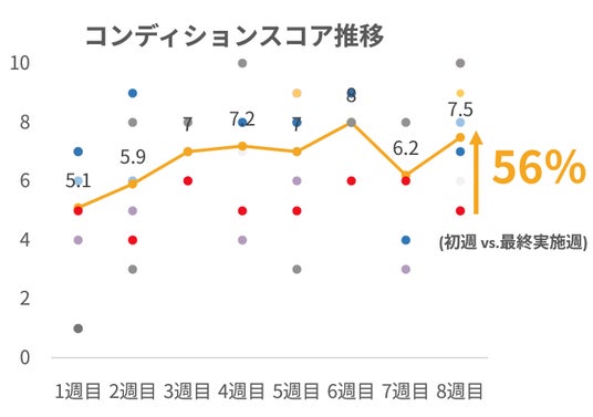 毎週、自らの状態を1~10点で評価するコンディションスコアは、開始初週と最終実施週を比較し、56%の向上が見られました。参加者からは、