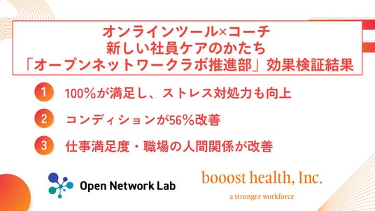 本件検証は、オープンネットワークラボ推進部のメンバー10名に対して、AIを活用した独自オンラインツールとコーチによる伴走を提供する企業向けメンタルケアプラットフォーム「メンタルトレーニングクラブBOOST」を試験導入し実施したものです。